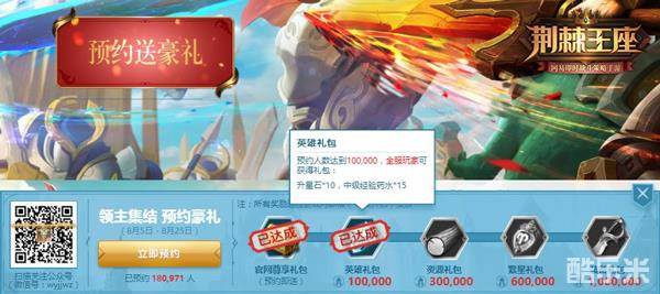 在公布上市时间的同时,《荆棘王座》全新官网也在今天正式上线,并且面向领主推出“公测集结活动”,从即日起到8月25日,所有在《荆棘王座》官网(http://jjwz.163.com/)进行预约参与集结活动的玩家,都能获得官网尊享礼包一份,而随着集结人数的增加,当集结总人数分别达到一定数量时,全服玩家还能获得额外的福利大礼包,最高可获得20级紫色装备一套。