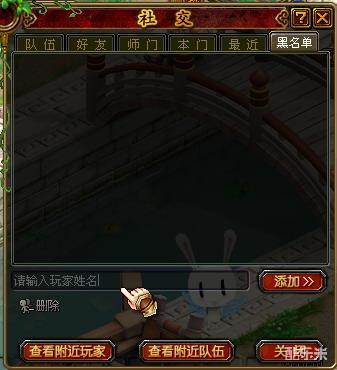屏蔽功能:这个功能类似于QQ里的黑名单,具体的操作是输入想屏蔽的玩家名字后按添加,把他加入屏蔽列表。另外也可以右击玩家名字,选中“屏蔽”。被加入黑名单里的玩家,他给你发送的任何信息都将被屏蔽。如果需要取消屏蔽,只需要选中屏蔽名单中的名字后按下面的删除即可。