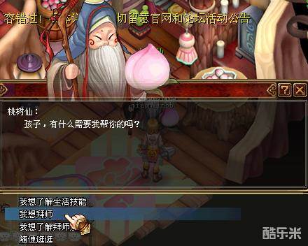 找到相关的NPC以后,就可以拜师了,需要提醒大家的是,各地拜师系统的方式一样,仅仅NPC不同。比如在“桃源村”,拜师系统的相关NPC是桃树仙,和他对话就会出现“我想拜师”的对话框提示。