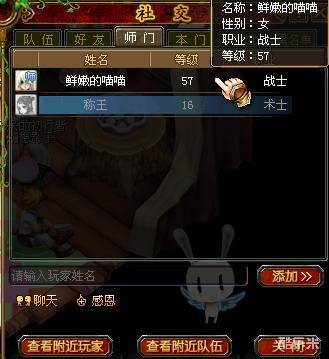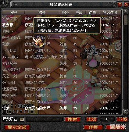 b、提示恭喜你拜得明师。这样最基本的师徒结构就组成了,你可以在“师门”页签里看到师父的信息,以及师父所带的其他徒弟。