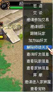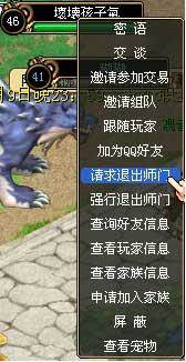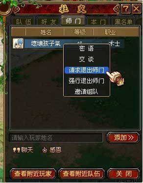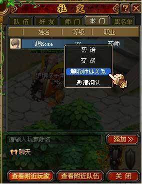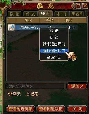 方式一:玩家右键菜单,在师父的右键菜单中选择“请求退出师门”或者“强行退出师门”
