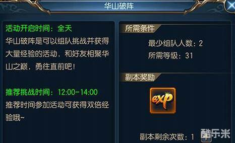华山破阵是东方不败手游中的活动之一,在这个活动中小伙伴们是需要集结众人的力量才可以进入活动中的。华山破阵的开启时间是全天的,所以小伙伴们不需要去特别关注它的时间。