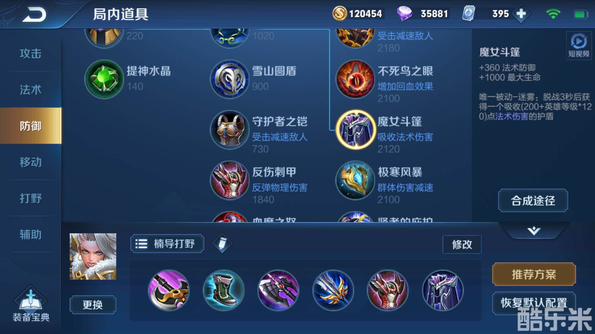 适当的防装能让她在这个版本站的更久,这版本射手很多,可以接着出一个反伤刺甲,最后补上魔女的斗篷,再后期可以换掉打野刀出复活甲或名刀。