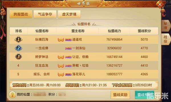 跨服盟战并不是无脑地比拼仙盟战力,第一步“盟战预约”可能就难倒了不少盟主。根据仙盟的实力预约最稳的对手,往往是排名逆袭的绝佳机会。当然,仙盟预约是一一对应的,这就考验各位盟主的手速了。一旦手慢,心仪的仙盟可能就被抢先预约了哦。