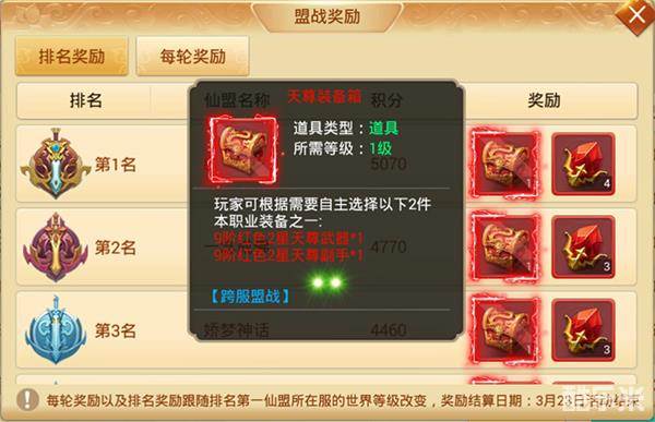 《剑逆八荒》跨服盟战的奖励分别会在每轮结束后和每月月底总排名结算后按时发放。可以说,总排名结算的顶级奖励正是所有参与跨服盟战的仙盟梦寐以求的——十六强中的前四名可以获得任意一件天尊神装!