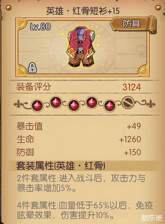 效果:2件套进入战斗后,攻击与暴击提升5%;4件套血量低于65%,免疫眩晕且伤害提升10%