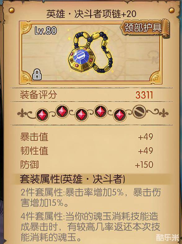 效果:2件套暴击提高5%,暴伤提高15%;4件套魂玉消耗技能造成暴击,有较高几率返还本次消耗的魂玉