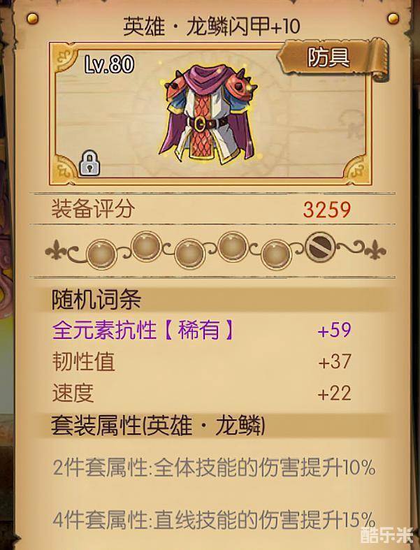 解析:目前来说,应该是最契合战国的套装,2件套破甲效果触发提高30%,降低敌方防御的,触发几率一般。但4件套的减伤效果对于战国来说是非常契合的。加上装备的数值属性,也都是偏防御的,与战国的契合度很高。