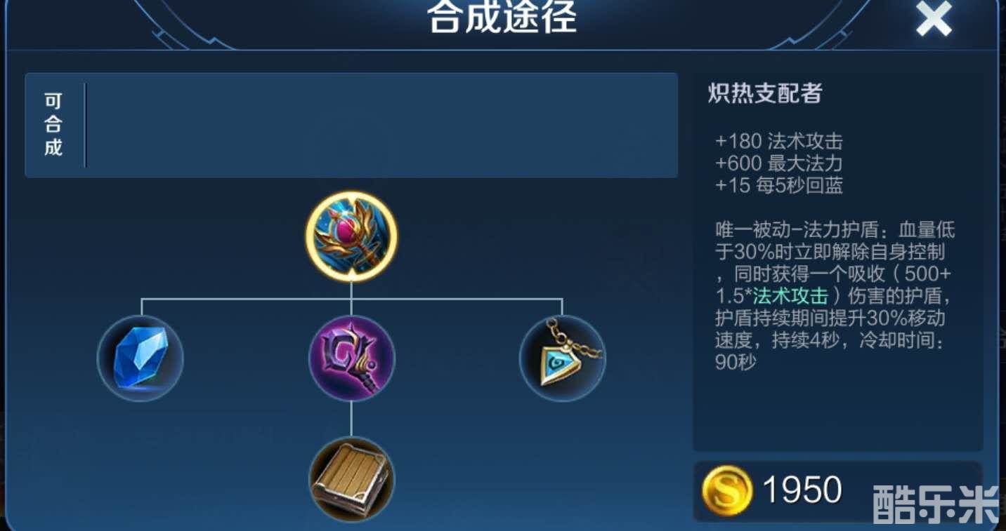 然后就是我们的神装炽热支配者了,有着180的法术攻击,并且有着600的法力加成,每5秒恢复15点蓝。本身就加600点蓝还有着恢复蓝的效果加上鞋子跟护符25+10+15就是每5秒恢复50点蓝,这样虽然不及圣杯但是也不缺蓝了足够你浪几圈了,这样出主要性价比在于支配着的被动哦,下面会说到。(主流鞋子的价格都是一样的,护符加支配者价格2070比起圣杯1800也贵不了多少)