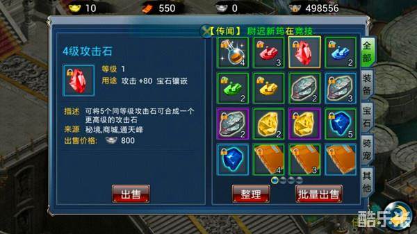 红宝石、蓝宝石、翡翠,《倚天》手机版中玩家完成“江湖行”和“通天峰”副本就有一定几率获得各种属性宝石,通过镶嵌,玩家可以将这些宝石添加到装备上以获得额外的属性加成。不过这里提醒大家,要想给装备镶嵌宝石,首先必须给装备打孔,打孔石(通天峰掉落)也分为三种:低级、中级、高级,不同品阶的装备需要使用不同等级的打孔石,而高级打孔石可以通过低级强化石合成得到。