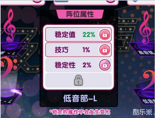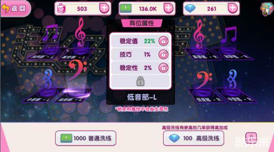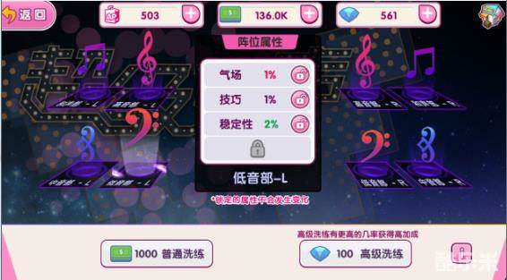 一个伴唱位最多有4条属性加成,当一个伴唱位属性加成的条数小于4时,每次洗炼都有一定的概率增加一条新属性加成。另外通过洗练玩家还可以改变伴唱位的加成属性和加成数值以此来获得更满意的加成类型和加成数值。