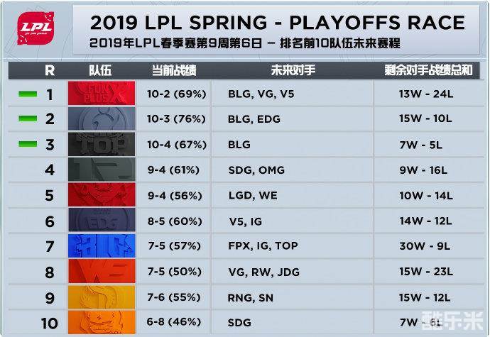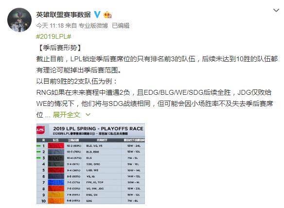昨天的LPL春季赛经过三场鏖战后,季后赛格局又出现了新的可能。英雄联盟官方数据列举出了几支游离于季后赛名额内外的几支战队的出线可能,其中RNG与JDG仍然有无法出线的可能。