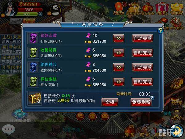 武功已经天下无敌,小打小闹已经看不上眼了吗?那不要紧,给橙色高级任务,敢接否?天拓游戏《倚天》中玩家如果对任务不满意,那可以通过刷新任务榜单获得新的任务,玩家每日有2次免费刷新机会,每轮悬赏任务只有4个,刷新后任务榜单会出现新的未接取任务,免费刷新次数用完,进入系统自动刷新模式,每隔30分钟系统自动刷新任务1次。