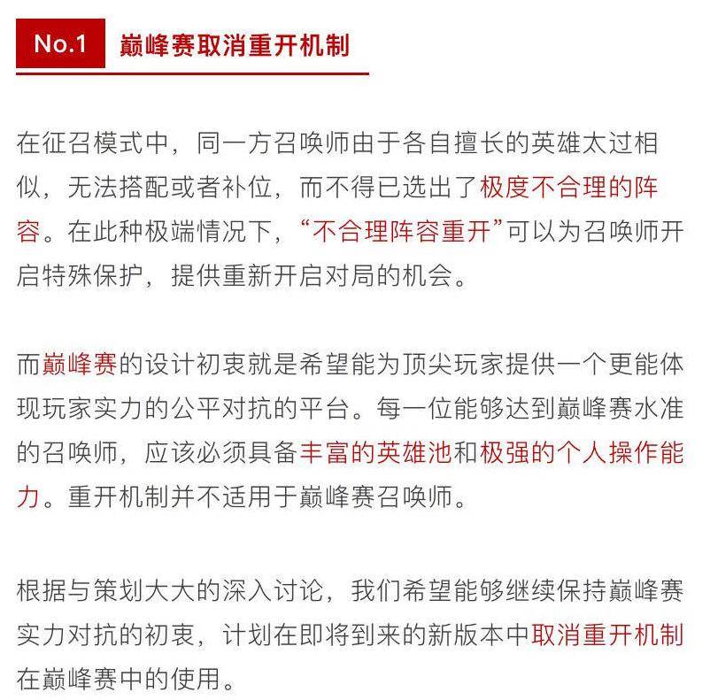 大家玩过巅峰赛的召唤师可能也知道,巅峰赛太容易重开了,选三个一样的英雄就可以重开,很多大主播打巅峰赛,一直重开,非常烦人,巅峰赛重开,本身就是对于巅峰玩家的质疑,都是巅峰召唤师了,英雄池都没有,还打什么巅峰赛,与设计巅峰赛的初衷相违和,巅峰赛取消重开真的是皆大欢喜了,再也不用担心刚选了强势英雄就重开了。