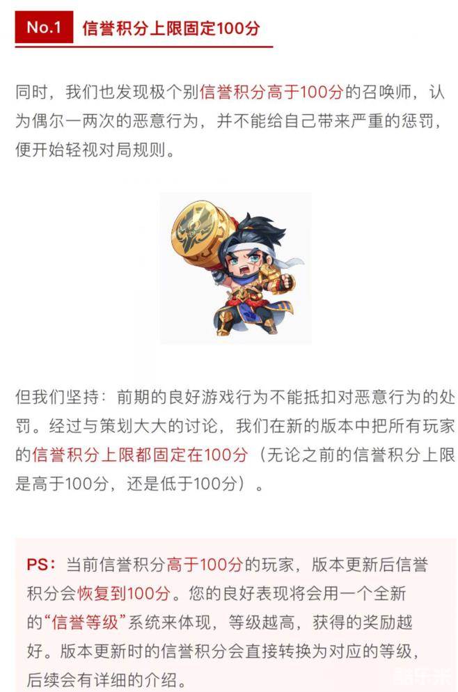 因为很多人都超过了100分,导致恶意行为一两次根本不会对他们造成很大的影响,又有了信誉积分不值钱的说法,所以信誉积分改版,上限100分,高于100分的玩家,更新之后统一变为100分,但是会出现等级划分,一起来看一下吧。
