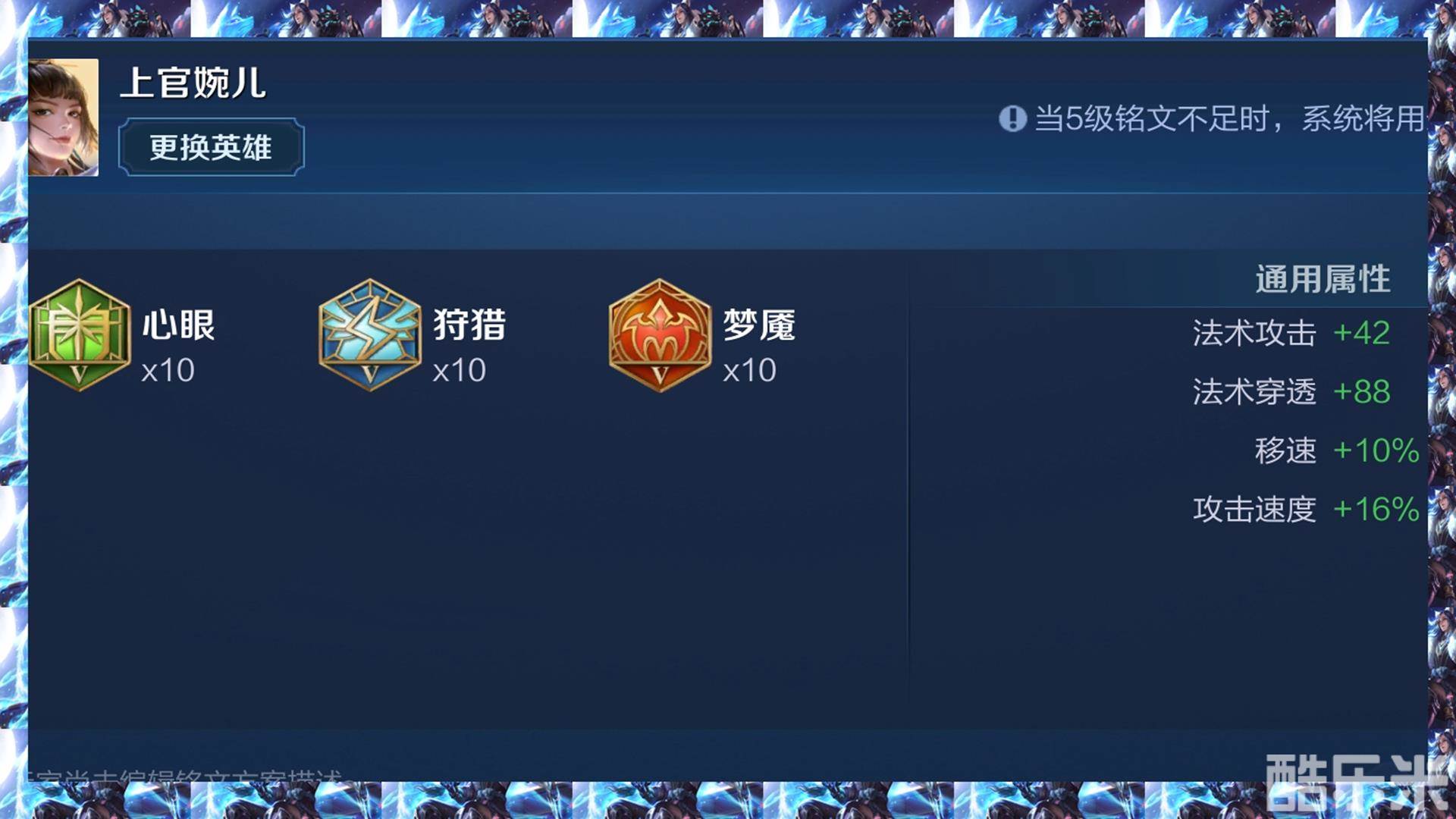 红色十梦魇、蓝色十狩猎、绿色十鹰眼。因为上官婉儿以爆发为主,所以从铭文发面就多从法术攻击和法术穿透下手。这套铭文也是很多国服婉儿喜欢用的铭文,经笔者实测,真是可信。