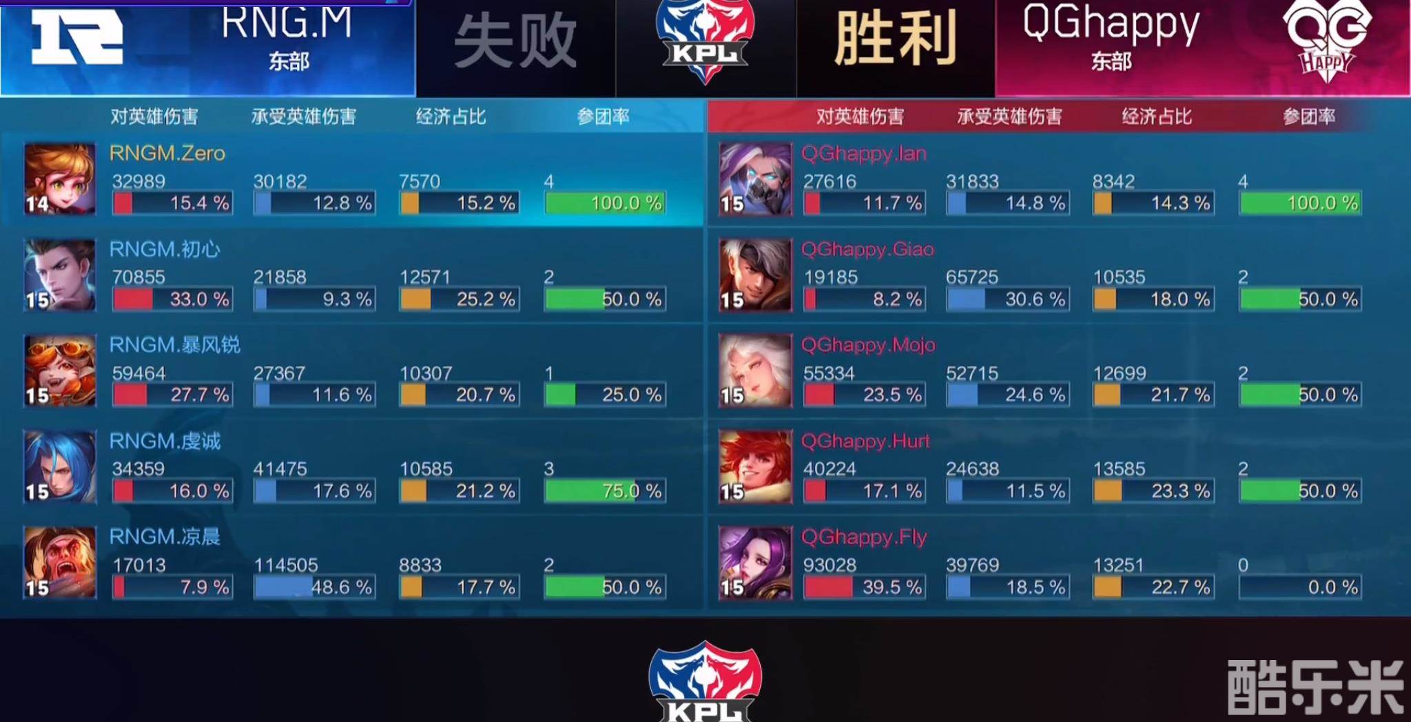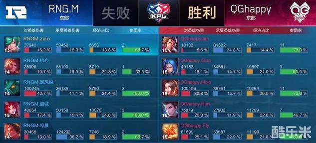 在第三局的比赛中,由于RNG.M没有爆发型强的英雄,Fly掏出一手芈月。Fly的芈月属于天秀型的,基本属于KPL中的第一芈月的存在。我们都知道芈月属于带线牵制型边路,用于带线推塔,单挑无敌,团战则十分乏力。但在这局比赛中,Fly使用芈月疯狂带线牵制,成功把局面打成Fly芈月一人上路激战RNG.M五人,QG其他四人抱团带线推塔的局面,这局的胜利,Fly功不可没,最终Fly芈月打出了40%的伤害,18.5%的承伤以及0-2-0的战绩,而Hurt的裴擒虎以2-0-0的战绩躺得MVP。