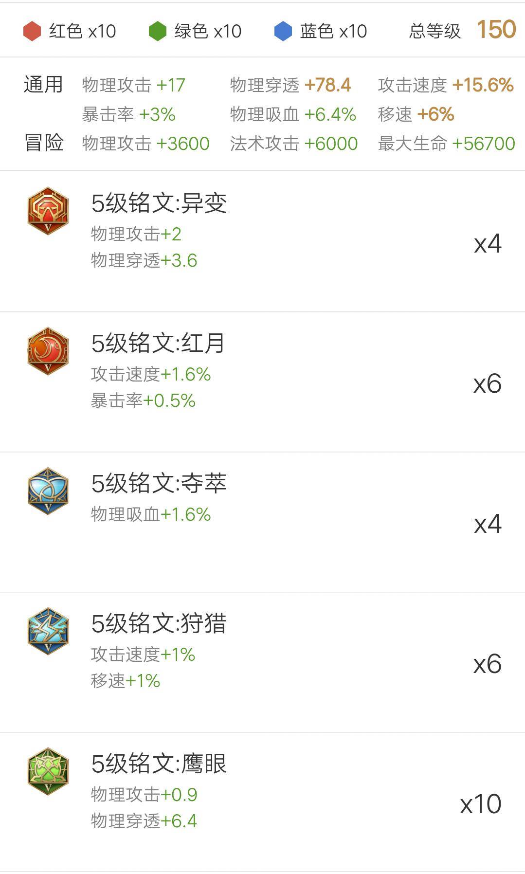 铭文推荐:异变*4,红月*6,夺萃*4,狩猎*6,鹰眼*10 (物理攻击+7,物理穿透+78.4,攻击速度+16.6%,暴击+3%,物理吸血+6.4,移速+6%)