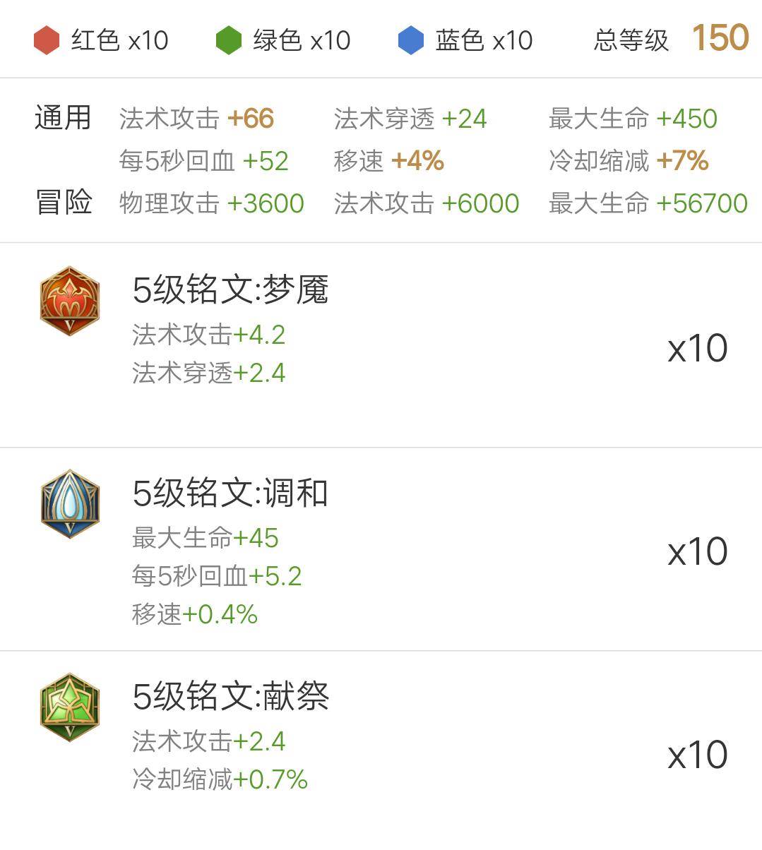 铭文推荐:梦魇*10,调和*10,献祭*10(法术攻击+66,法术穿透+24,最大生命值+450,每5秒回血+52,移速+4%,冷却缩短+7%)
