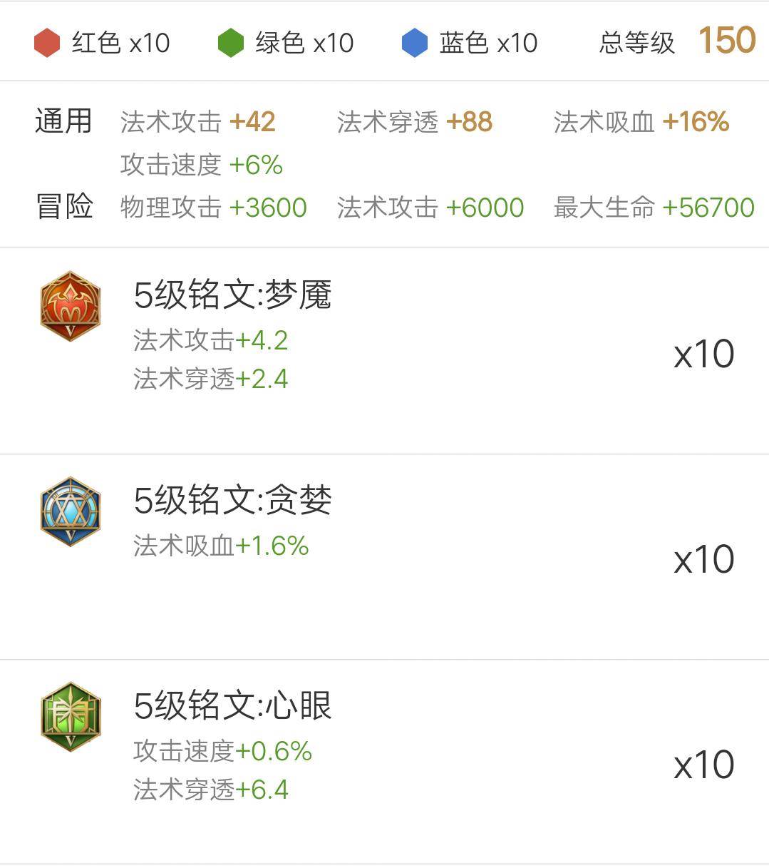 铭文推荐:梦魇*10,贪婪*10,心眼*10(法术攻击+42,法术穿透+88,法术吸血+16%,攻击速度+6%)