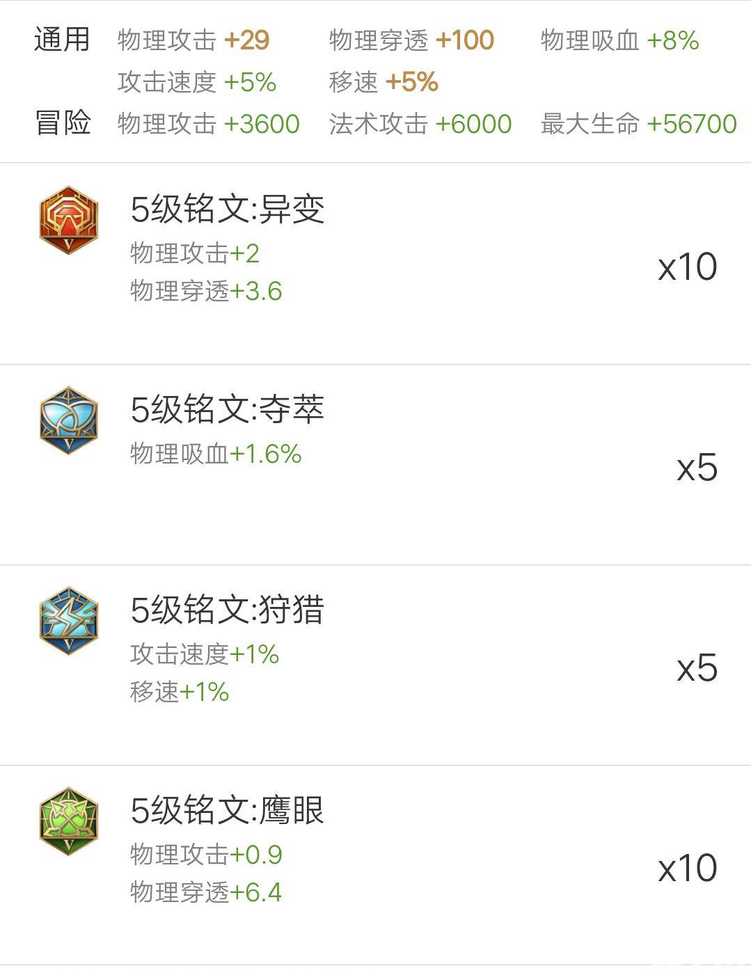 铭文推荐:异变*10,夺萃*5,狩猎*5,鹰眼*10(物理攻击+29,物理穿透+100,物理吸血+8,攻击速度+5%,移速+5%)