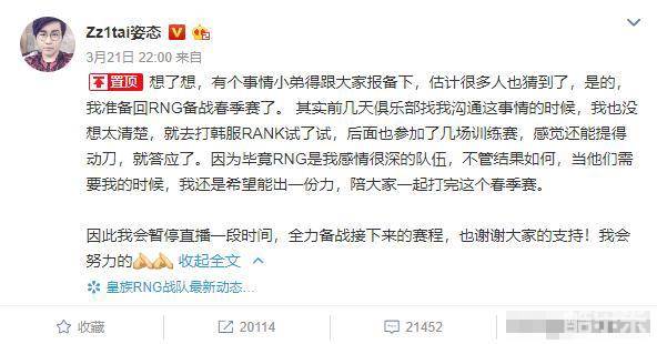 昨晚姿态突然更新动态,他写道:我准备回RNG备战春季赛了,我去韩服Rank试了试,后来也打了几场训练赛,结果还可以,我就答应了,毕竟RNG是我感情很深的战队,不管结果如何,当他们需要我我还是希望可以出一份力,陪大家打完春季赛。