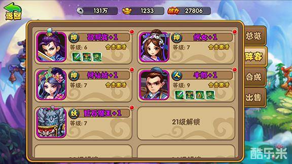 首先进入游戏,熟悉基本规则和玩法后,就可以开始速度推图了。前几章副本每一章中间的宝箱都会给一个武将或者装备,很容易就凑齐了入门阵容:吕洞宾,何仙姑,九天玄女,织女,巨石魔王。