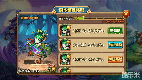 后续的话还是以凑齐橙将为目标了。还好橙卡基本都可以靠刷副本来获得碎片。另外每一章尽量都达到3星,一方面可以点将星护脸,另一方面每章的三星宝箱会给不少橙将碎片,打到第9章就能凑齐一张小青。