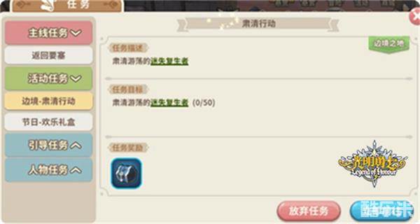 不仅如此,在边境之地内每天都会有每日任务等待勇士们去完成,任务将随机要求勇士肃清边境之地的某种怪物,完成后可以获得经验、公会荣誉等奖励。不过,需要留意的是,如果是第一次进行任务,需要先完成总司令莫里斯处的引导任务才会开启~