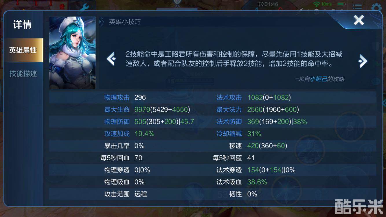 很多玩家可能会觉得这套出装没有输出,但是从装备和属性上我们可以看到,王昭君依然具备较高的法术攻击,到了后期如果对面较肉的话可以把吸血书或面具换成虚无法杖,所以说这套装备的选择并不会对王昭君的输出有多大影响,但在生存能力上却得到很大的强化,这套出装只要二技能可以冻住敌方英雄,就算是坦克依然可以秒杀。
