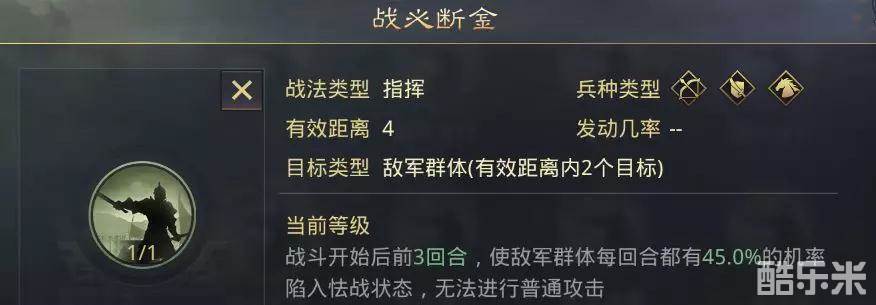 【战必断金】是主公们最熟悉的战法之一了。无论是开荒还是克制“菜刀队”都是十分强力的,关于该战法的搭配亦是老生常谈,在此就不多赘述了。