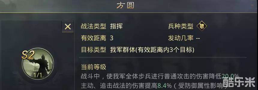 【方圆】可以提高我军全体步兵的主动和追击战法的伤害,但是会降低普攻的伤害。当孙坚所在队伍的核心输出是依靠主动战法的武将时,高防御成长的孙坚携带受防御属性影响的【方圆】是一个不错的选择。