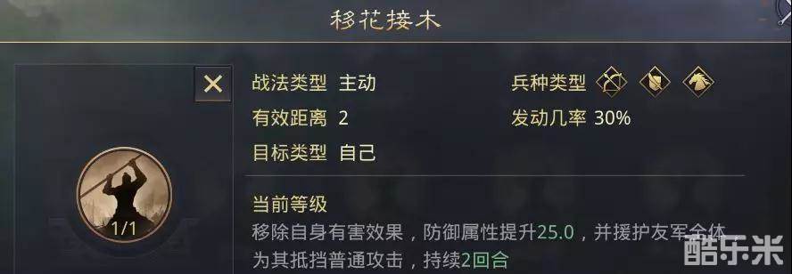 【移花接木】还会移除孙坚的有害效果,并且能提高防御属性。