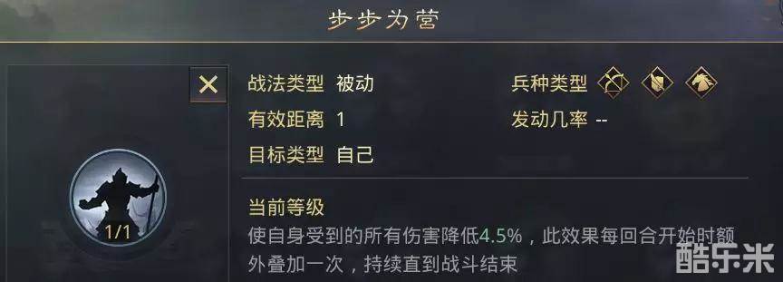 【步步为营】可以为孙坚提高一定的坦度,这一战法的特点是越到后面几回合,减伤效果越强。而孙坚因为【遗志】的第三回合极强恢复效果的特性,与【步步为营】的契合度是很高的。