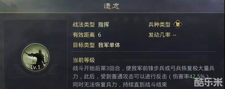 孙坚自带指挥战法【遗志】是一个拥有恢复与反击双重效果的战法。战斗开始后第3回合,使我军前锋步兵或弓兵恢复极大量兵力。此后,受到普通攻击可以进行反击。同时无法恢复兵力。