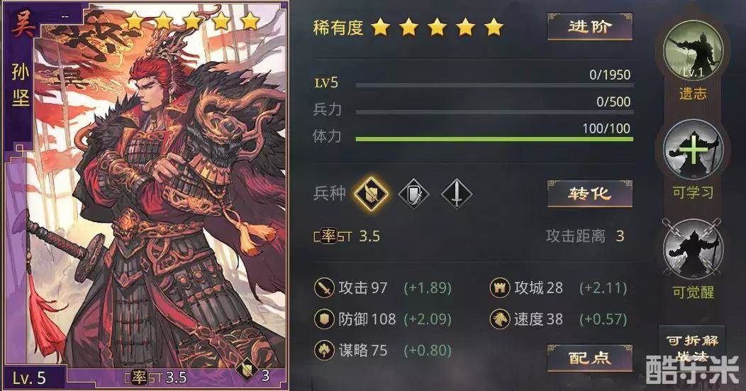 2.09的防御成长作为前排是足够的,配合自带指挥战法【遗志】的强力恢复效果,可以使孙坚成为一个不错的坦克武将。