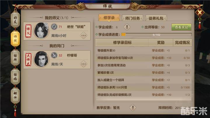 收徒的基本奖励以阶段奖励方式为主,比如当修学录成绩达到0、30、50、70、90、100时,系统会给予师父不同阶段的出师奖励,而且奖励涉及的范围包括经验、药品、宝石、材料、英雄等等。当徒弟越快达到相应出师阶段,那么师父所获得的奖励也迅速,而且当徒弟的数量庞大时,师父则会每天都受到大量的阶段性奖励礼包。日积月累之下,奖励丰厚的程度让任性的少侠都会羡慕嫉妒恨。但由于修学录成绩并不影响徒弟的收益,因此徒弟们常常不太积极,建议各位是师父还要多多动员才好!