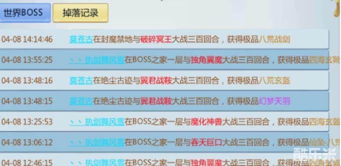 点击掉落记录,可以看到其他玩家挑战BOSS所掉落的装备奖励;