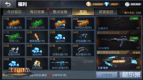 《生死狙击》手游的每日签到则更为人性化一点,虽然心意略有不足,但是诚意满满,每日签到后可以对应获得签到日历中的奖励,奖励一目了然,而累积签到熟练多的奖励是按照你一共签到的次数来计算的,也就是说如果玩家没空忘记签到了,累积到最后也是可以获得30天的幻影弓弩的奖励的,这点可以让很多平时比较少玩手机游戏的玩家也可以获得累积奖励,可以说是诚意满满。