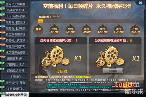 页游和手游中还有很多每日在线累积的奖励的,比如说神器工厂的日常获得,通过在线时长来直接获取神器碎片,只要在线时间够的玩家,完全可以通过该日常活动来积攒碎片来获得属于你的终极神器。