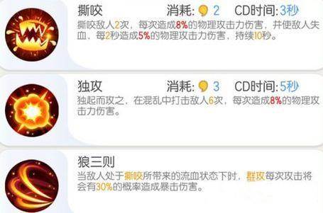 群攻在敌方没有处于撕咬的流血效果下时,伤害一般。而撕咬技能的很大一部分伤害占比来源于流血效果。所以在场上应首先使用撕咬,随后不断使用群攻配合被动狼三则打出暴击,直至撕咬的流血效果消失。如此循环,方能让该角色的攻击最大化。