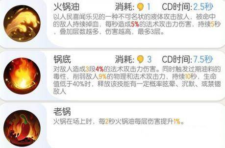 自己吃火锅,敌人吃火锅底料~火锅的被动老锅决定了他要长时间在场上使用火锅油在敌人身上叠满3层debu,然后释放锅底减少对方的物理和法术攻击,再不断释放火锅油,使敌人身上的debu不断,打出最大的伤害,别忘了在火锅生命低于40%时锅底有一定概率造成控制效果。