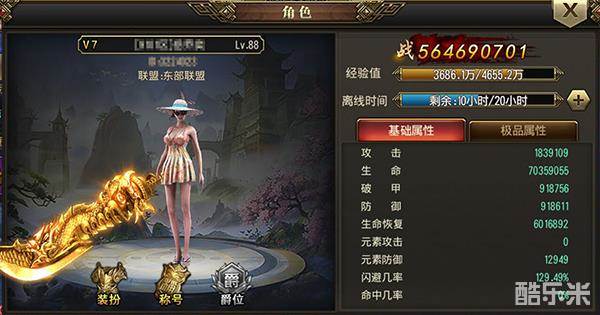 打开人物面板,就可以清楚的了解自己角色的所属联盟、剩余升级进度、基础属性、极品属性等基础信息,同时玩家也可以在此处补充自己的离线时间,确保即使角色不在线也有足够的经验收益。