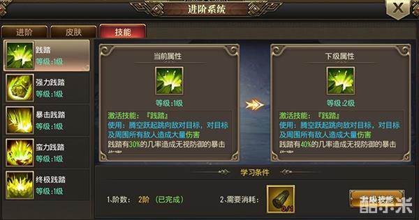 蛮力践踏:践踏造成的伤害额外提升,如果敌人的坐骑等阶低于你,则践踏还会将其击晕1秒;