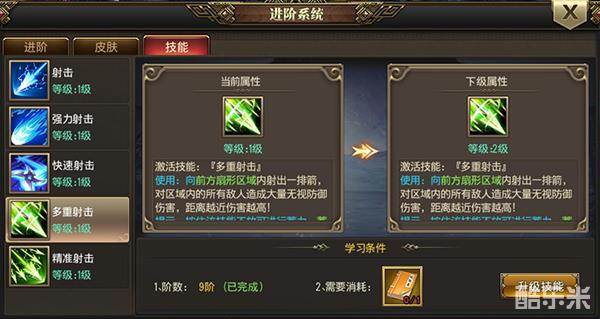 多重射击:向前方扇形区域内射出一排箭,对区域内的所有敌人造成大量无视防御伤害,距离越近伤害越高