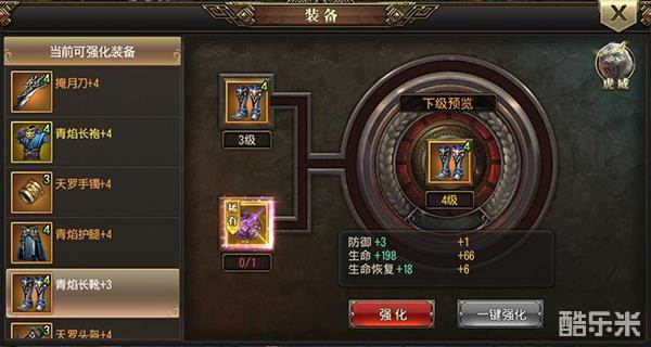 除了搜集套装之外,玩家还需要对装备进行强化,强化是不受到更换装备而变化的,强化需要使用强化石,装备强化等级越高,消耗的强化石也越多,强化石可以通过分解装备等渠道获得,大强化等级满足条件后,还能激活被动技能虎威,造成更多的伤害。