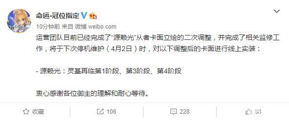 “新的风暴”已经出现,根据《命运:冠位指定》的官方微博,“源赖光”从者卡面立绘的二次调整已经完成,相关监修工作也已完成,将于下次停机维护(4月2日)时,对调整后的卡面进行线上实装。