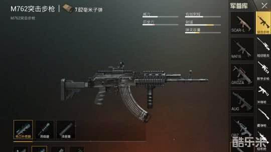 第二M762:作为版本更新以后的新一代步枪之王,M762的优点想必大家已经很熟悉了,伤害高,射速非常快,杀伤力最为致命,缺点就后坐力非常大。一般玩家玩裸配的M762简直就是在打野鸡,而最为关键的驾驭方法就是装配垂直握把,核心在于垂直握把,而M762如果没有装配垂直握把,无异于鸡肋武器,40发子弹枪枪飞天。当然如果在搭配枪口补偿器能更加好能降低后坐力,当然喜欢消声器也行看玩家们喜好。