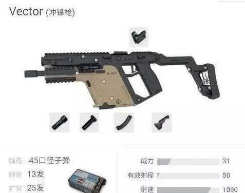 第五维克托(vector):在刺激战场游戏中的出场率实在太低了,除了一些电脑。几乎很少看到过有玩家使用这把枪。但是小编要说这把枪很强,冲锋枪的王者就是它早已公认。而且vector是相当吃配件的,而最为核心的配件就是扩容啦,扩容以后弹夹才25发,容错率超级低,没有扩容很容易一梭子弹下去没打中,有了扩容近战直秒敌人不用任何犹豫。