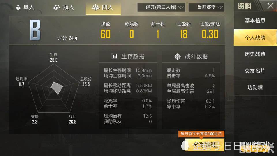 看到上面这位玩家的战绩,游戏君真的是忍不住的笑了半天~据了解,这位玩家自称自己是“机器人玩家”,水平实在是太菜~好吧,60局游戏,仅有1次前10,KD达到了惊人的0.3~这样的战绩,恐怕也只有真正的机器人才能达到吧?所以有网友称赞:作为机器人,你很合格~建议光子让你去上班,做一位机器人大队长~嘿!